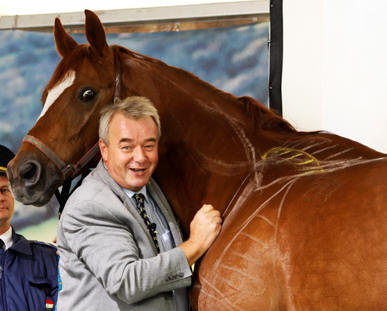 Prof. Dr. Dr. hc. Sótonyi Péter ezúttal élő lovon demonstrálta az előadásában említett anatómiai képleteket, melyeket minden lóval foglalkozó embernek illik ismernie. A két derék sárga derekasan állta a színpadi megpróbáltatásokat.