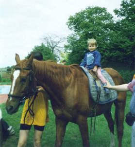 Egy szürke pónin kezdtem lovagolni, akit Lucifernek hívtak. Csak futószáron lehetett rajta ülni, mert másképp kezelhetetlen volt, nekiment a falnak. Nagyon NEM szerettem lovagolni járni, ezért a heti fél óra helyett hetente kétszer negyed órát ültem rajta. Utána évekig a Barbi nevű, tarka pónilovon lovagoltam.