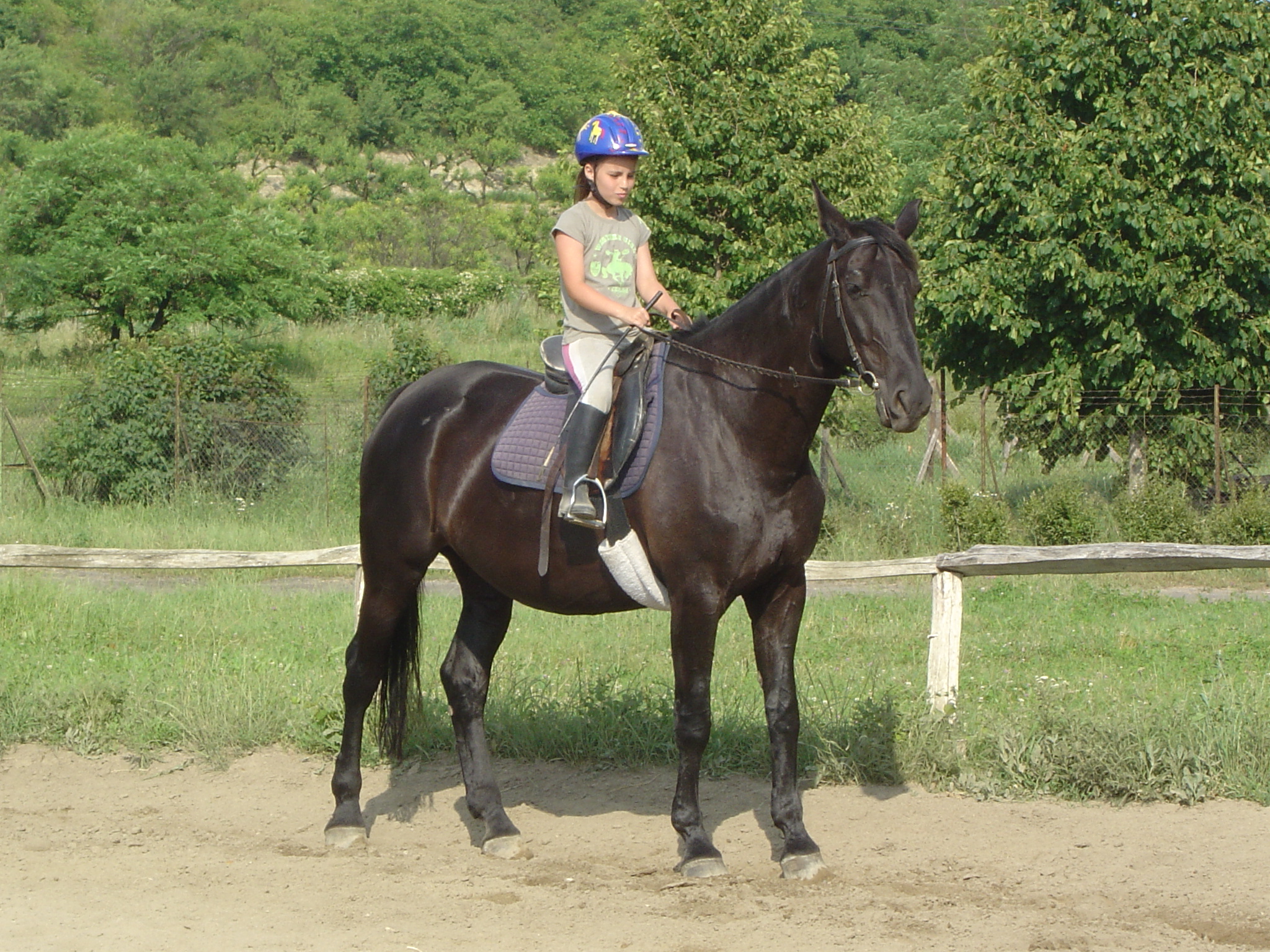 Eddigi pályafutásom legkedvesebb lova Aladin 2002.születésű sötétpej Connemara póni. Hivatalos neve Day Dream, hozzám már Aladin becenévvel kerültJ. Vándor Zsófia tulajdonában (és Ő is lovagolta) válogatott keretes ugró-póni volt. Mikor Zsófi kinőtte Alcsit, hozzám került kipróbálásra és hamar beleszerettem, bár az első idők elég viszontagságosak voltak (minden edzésen jó nagyot repültem a hátáról-szerencsére komolyabb sérülés nem történtJ ). Aladin velem együtt tanulta a díjlovaglás alapjait 2009 őszétől. Első versenyünk (és első közös sikerélményünk- I.helyezés) 2009 novemberében volt, ekkor 2 hónapja dolgoztunk együtt. A 2010. évet kisebb sikerekkel zártuk, majd az a megtiszteltetés ért bennünket, hogy Gyula bácsi 2010 novemberében bevett minket a Xenophon Csapatba és elkezdett velünk foglalkozni. Az ezt követő nyáron nagyon szép eredményeket értünk el, többek között sikerült a Talentum kupa Utánpótlás Országos Bajnokságát megnyernünk.